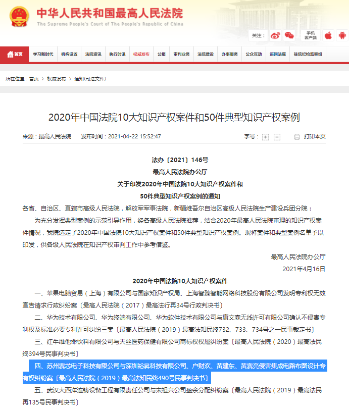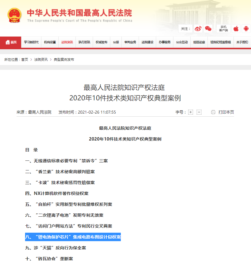 On the “World Intellectual Property Day” on April 26, 2021, the “lithium battery protective chip Integrated Circuit Layout Design Infringement Case” [(2019)最高法知民终490号] , in which the two founding partners at Junlong Law Firm, Mr. Zhu Aijun and Mr. Ding Jianchun jointly represented the plaintiff, Suzhou Saixin Electronic Technology Co., Ltd. , was selected as “Top 10 Intellectual Property Cases in Chinese Courts in 2020”. It is a well-known habit of the Supreme People’s Court, since 2009, to announce to the public, on the eve of World Intellectual Property Day every year, the 10 most valuable and influential intellectual property cases handled by Chinese courts at all levels in the previous year for the sake of reference for future examination. There were in total 525,618 intellectual property cases heard in Chinese courts in the past 2020, and our case stood out from the above 520,000.